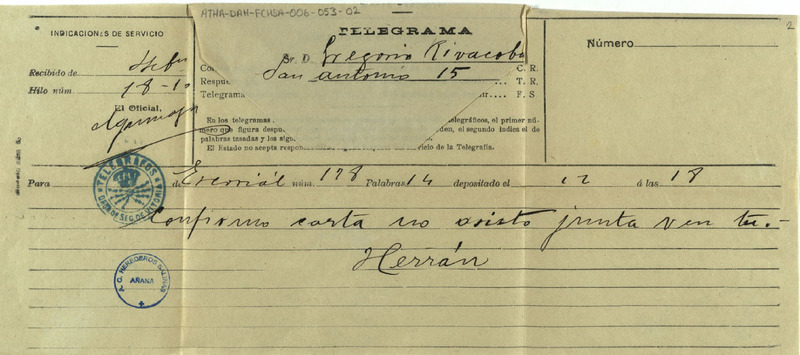 Componentes especiales del documento: 1.- Sello "Telégrafos Vitoria": Sello afigurativo profesional. Sello circular de tinta azul y de. 2,8 cms de diámetro. Campo: manojo de rayos bajo corona. Orla: TELEGRAFOS. ORGA. DE. SEC. DE VITORIA
