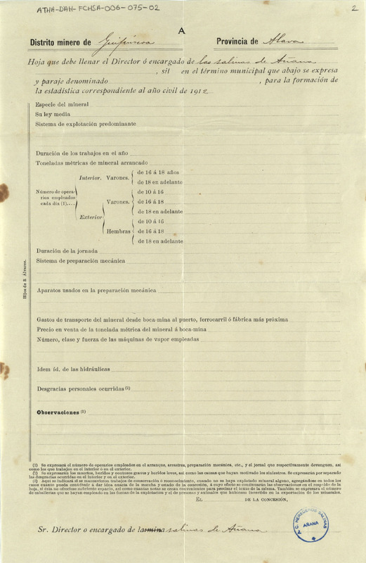 Formulario destinado a ser cumplimentado con la estadística minera de Salinas de Añana correspondiente al año 1912