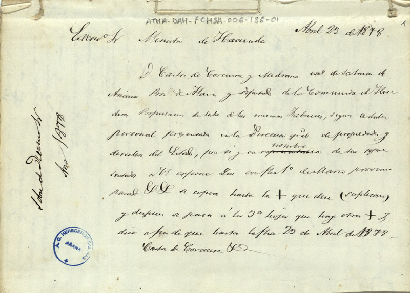 Instrucciones de Cástor Corcuera, Diputado de la Comunidad de Herederos de las salinas de Añana, para que se redactara un oficio dirigido al Ministro de Hacienda partiendo del borrador que ya había escrito