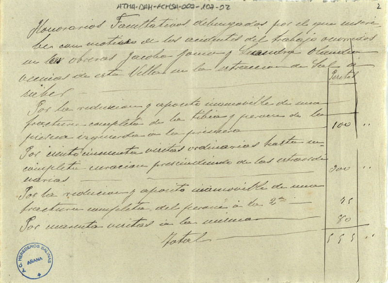 Cuenta de los honorarios facultativos devengados por Gerardo Palacios, médico, con motivo de los accidentes de trabajo que padecieron Jacoba Gómez y Leandra Onandía, vecinas de la villa de Salinas de Añana, mientras procedían a la extracción de sal