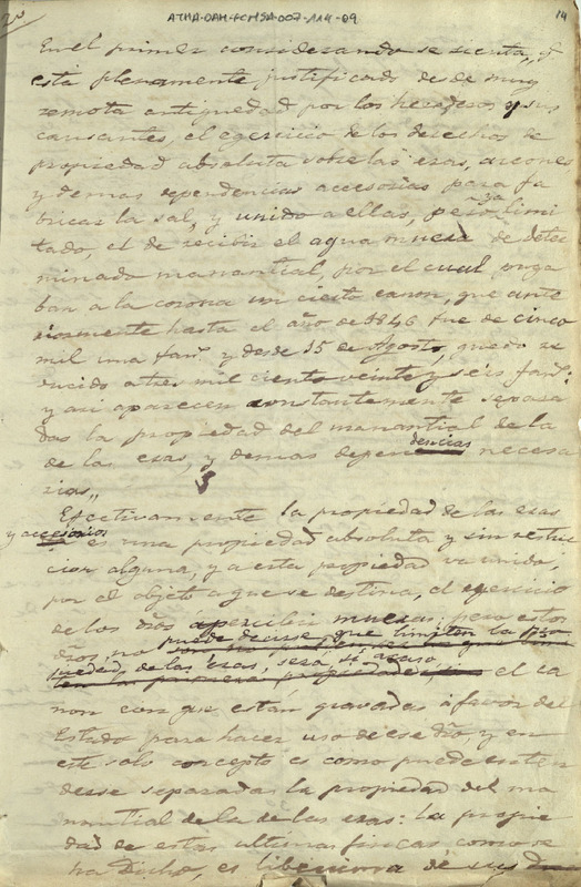 Borrador de un memorial de Castor Corcuera Medrano, Diputado de la Comunidad de Herederos de las salinas de Añana, dirigido al Ministro de Hacienda, solicitándole ordenara la rectificación de una orden que conculcaba los derechos que los dichos herederos disfrutaban sobre la propiedad de las eras y sobre el uso de las fuentes manantiales