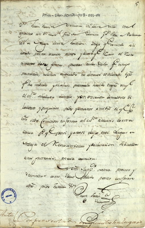 Instancia de Juan Sáenz de Valluerca solicitando que se comisionara a un escribano para que reconociera las firmas de Pedro Sáenz de Valluerca y Manuel Fernández de Palomares, en los documentos en los que declaraban que le debían dinero