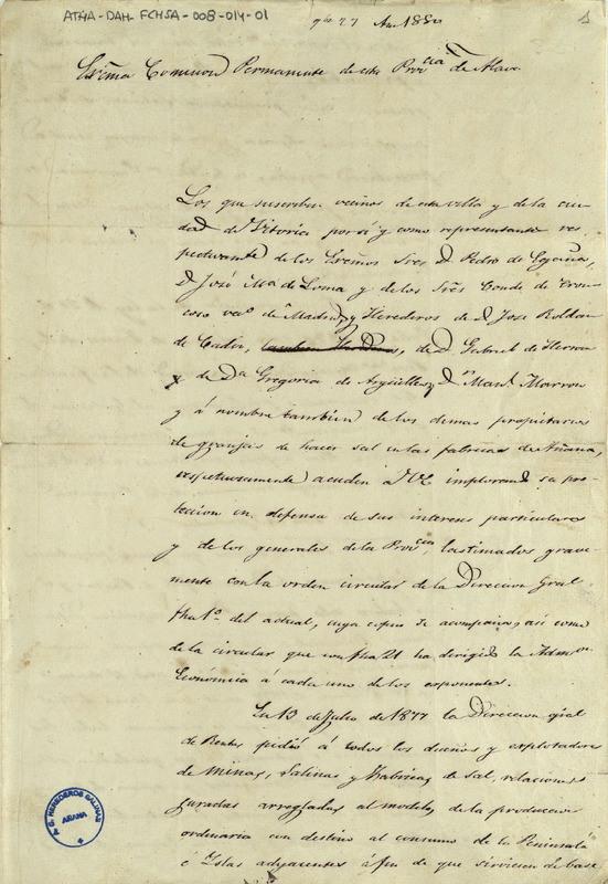 Copia simple de una instancia de la Comunidad de Herederos de las salinas de Añana, dirigida a la Comisión Permanente de la Diputación Provincial de Álava, solicitando que no se aplicara a dichas salinas el nuevo impuesto a las fábricas de sal, implantado por el Gobierno