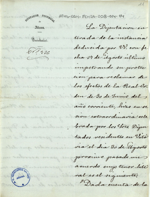 Oficio de la Diputación Provincial de Álava dirigido a la Comunidad de Herederos de las salinas de Añana, adjuntándole una copia del recurso que había interpuesto ante el Ministro de Hacienda, relativo a la aplicación impuesto sobre las fábricas de sal a dicha Comunidad