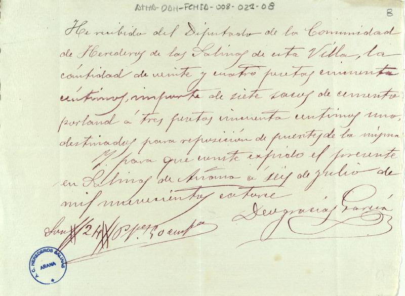 Recibo de 24,50 pesetas otorgado por Deogracias García en favor de Ubaldo Cruzado como Diputado de la Comunidad de Herederos de las salinas de Añana, por siete sacos de cemento para la reposición de varios puentes