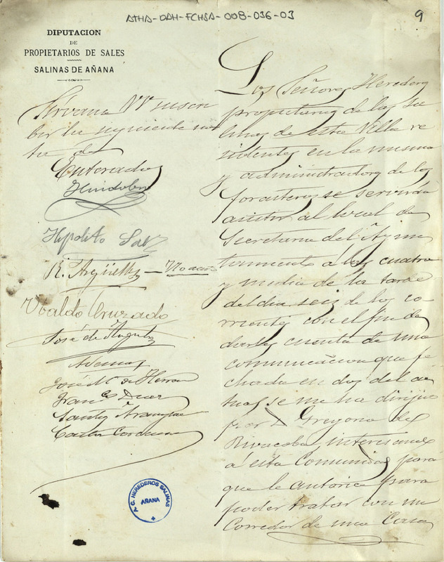 Circular de Castor Corcuera Medrano como Diputado de la Comunidad de Herederos Propietarios de las salinas de Añana, convocando a Junta General a los miembros de la misma, con el objeto de tratar una comunicación de Gregorio Rivacoba Larrazábal sobre la instalación de una industria de fabricación de sosa cáustica en el Valle Salado
