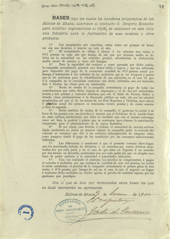 Bases dispuestas por la Comunidad de Herederos Propietarios de las salinas de Añana, autorizando al copropietario Gregorio de Rivacoba Larrazábal, para que entablara negociaciones con objeto de establecer en la dicha villa una industria para la fabricación de sosa cáustica u otros productos