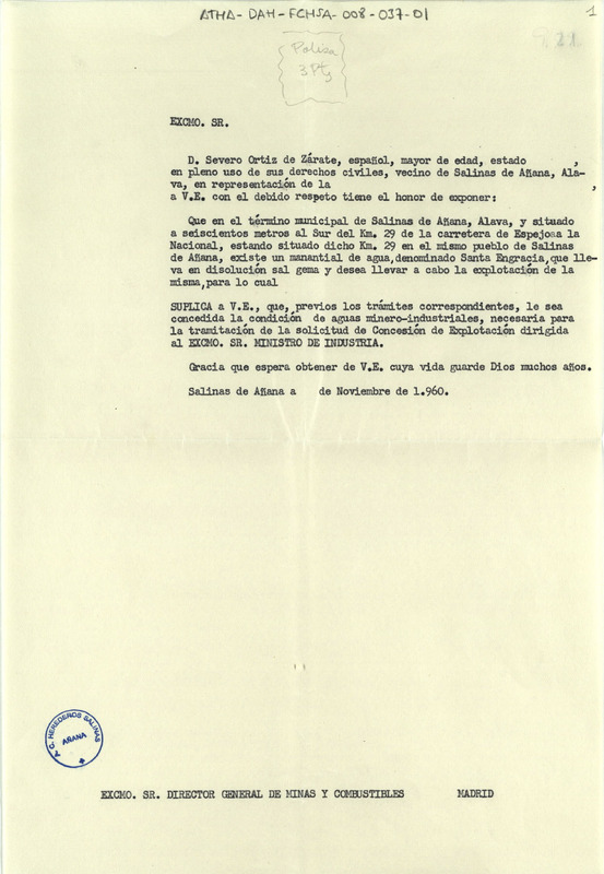 Instancia de Severo Ortiz de Zárate, vecino de Salinas de Añana, dirigida al Director General de Minas y Combustibles del Ministerio de Industria, solicitando le sea concedida la condición de aguas minero-industriales al manantial de sal gema denominado Santa Engracia, sito en la jurisdicción de la dicha villa, necesaria para la tramitación de la solicitud de concesión de explotación