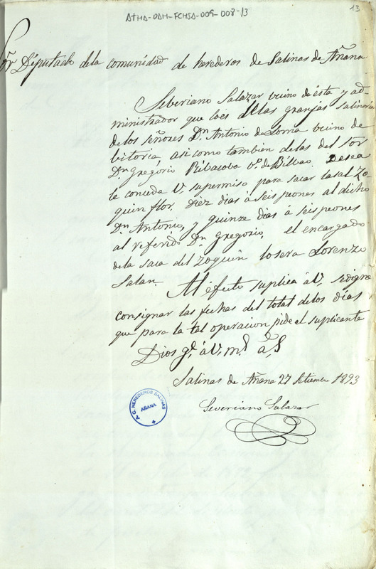 Instancia de Severiano Salazar dirigida al Diputado de la Comunidad de Herederos de las salinas de Añana, solicitando permiso para proceder a la saca de sal flor