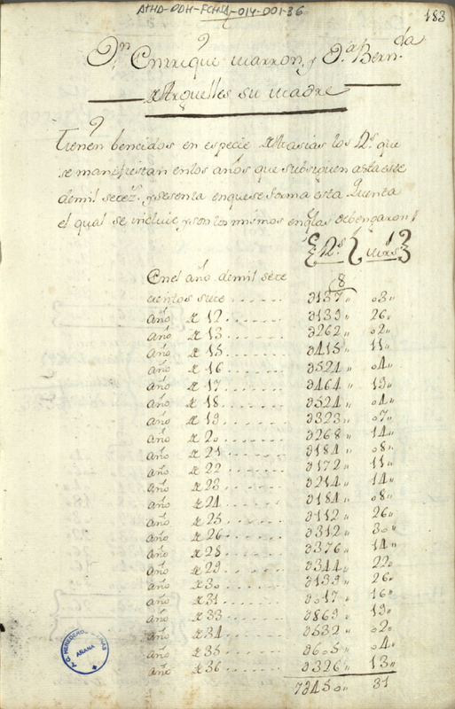 Cuenta de los fondos resultantes por la entrega de las masías de sal a la Hacienda pública desde el año 1707 hasta el año 1772, por parte de Enrique Marrón y Bernarda de Argüelles