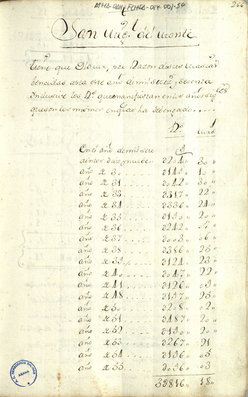Cuenta de los fondos resultantes por la entrega de las masías de sal a la Hacienda pública desde el año 1719 hasta el año 1770, por parte del monasterio de San Miguel del Monte