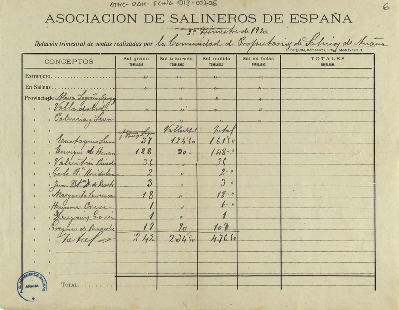 Cuenta de la sal vendida durante el segundo trimestre de 1920 por la Comunidad de Herederos de las salinas de Añana, en las provincias de Álava, La Rioja, Burgos, Valladolid, Palencia y León