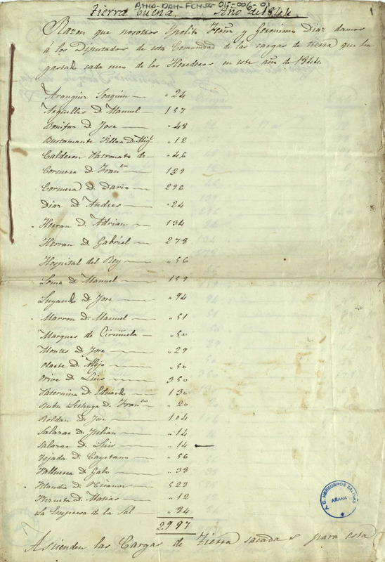 Cuenta de la saca de tierra buena que los miembros de la Comunidad de Herederos de las salinas de Añana habían utilizado para sus granjas durante el año 1844, certificada por Hipólito Fernández y Jerónimo Díaz de Tuesta