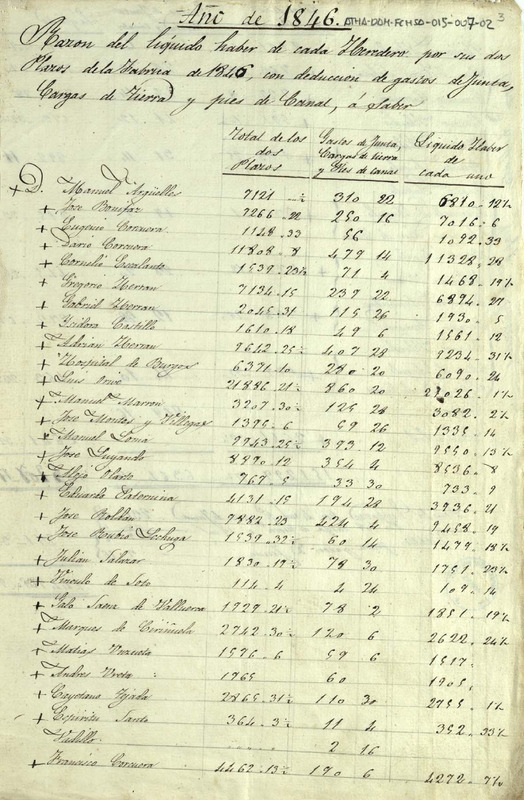 Razón del haber de cada miembro de la Comunidad de Herederos de las salinas de Añana por los dos plazos de la fábrica de la sal de 1846, descontando los gastos de junta, saca de tierra y pies de canal