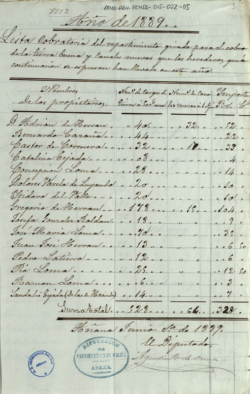 Lista cobratoria expedida por Agustín Ruiz de Osma, de las sacas de tierra buena y pies de canales empleados por los miembros de la Comunidad de Herederos de las salinas de Añana para sus eras de sal durante el año 1889