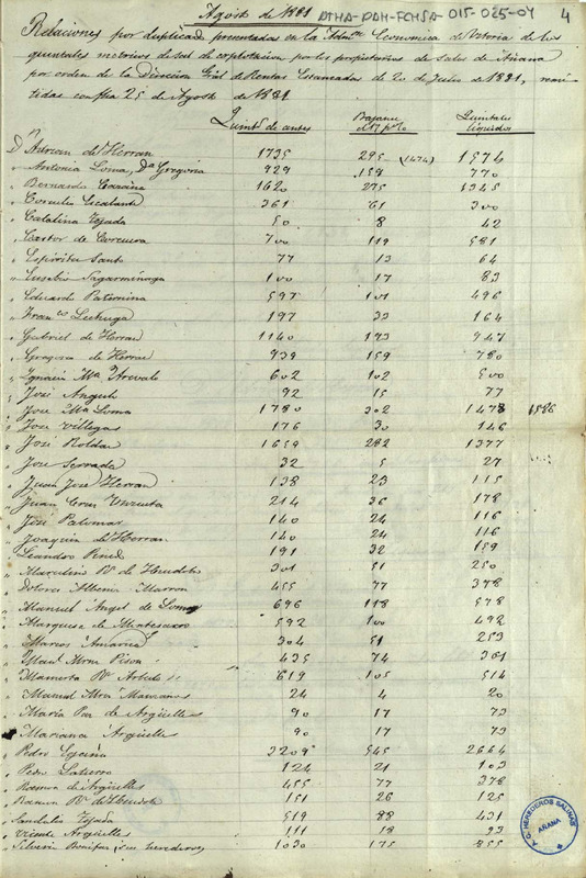 Relación del número de quintales métricos de sal fabricados por los miembros de la Comunidad de Herederos de las salinas de Añana hasta agosto de 1881, y presentada en la Administración Económica de Vitoria