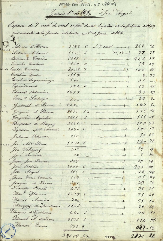 Reparto de los gastos de junta entre los miembros de la Comunidad de Herederos de las salinas de Añana acordado en junio de 1880