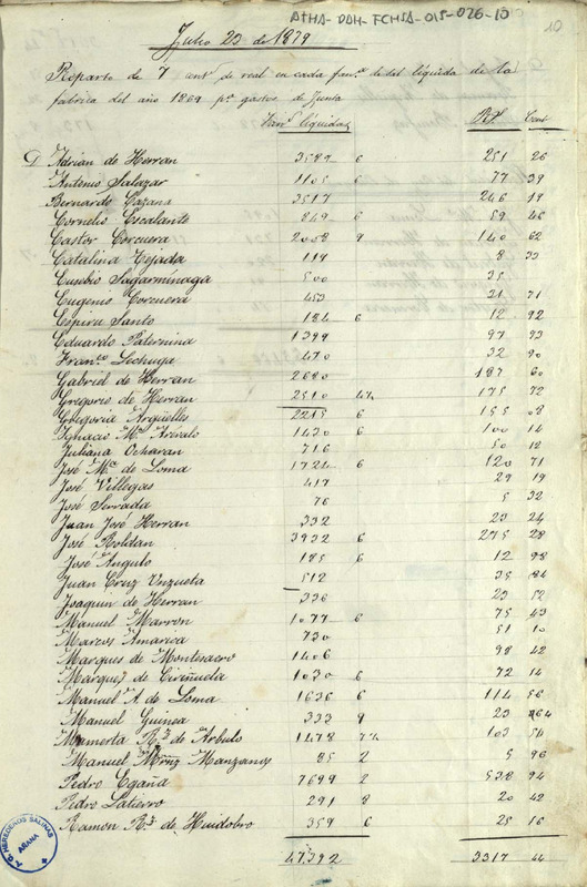 Reparto de los gastos de junta entre los miembros de la Comunidad de Herederos de las salinas de Añana acordado a 23 de julio de 1879