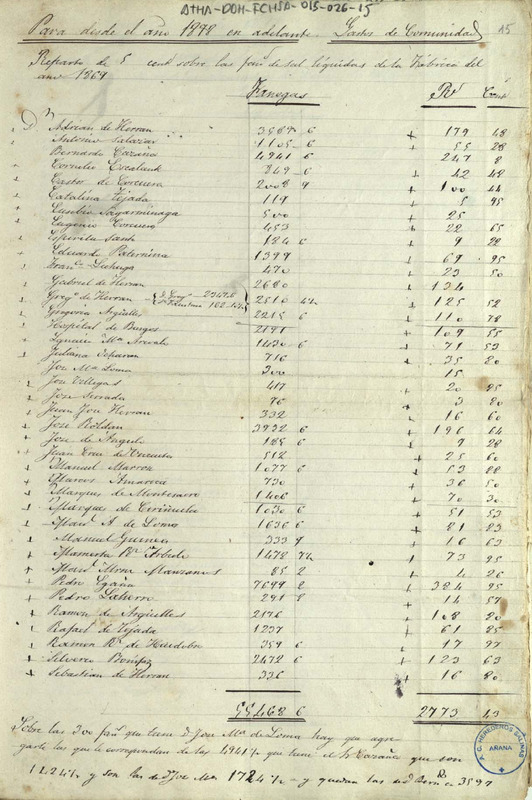 Reparto de los gastos de junta entre los miembros de la Comunidad de Herederos de las salinas de Añana acordado para el año 1878 en adelante