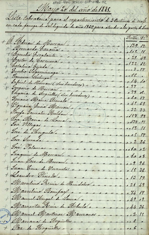 Lista cobratoria para el repartimiento de 3 céntimos de real por cada fanega de sal líquida del año 1869, para antender los gastos de junta entre los miembros de la Comunidad de Herederos de las salinas de Añana, en el año de 1885