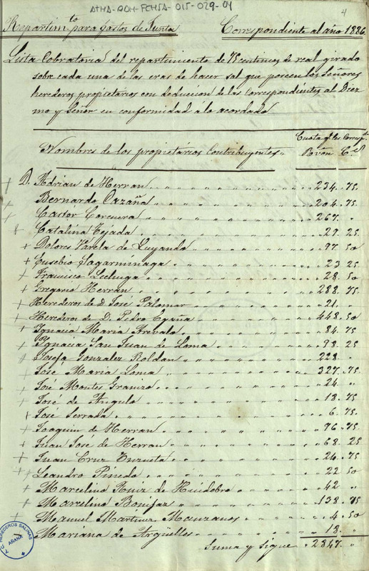 Lista cobratoria del repartimiento de 75 céntimos de real por cada fanega de sal entre los miembros de la Comunidad de Herederos de las salinas de Añana, para el pago de los gastos de junta de 1886
