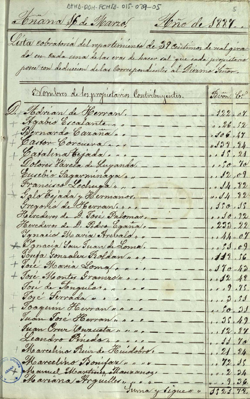 Lista cobratoria del repartimiento de 39 céntimos de real por cada fanega de sal, para gastos de junta entre los miembros de la Comunidad de Herederos de las salinas de Añana, correspondiente al año 1887