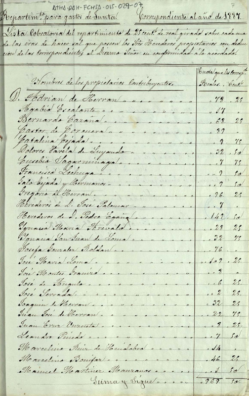 Copia simple de la lista cobratoria del repartimiento de 25 céntimos de real por cada fanega de sal entre los miembros de la Comunidad de Herederos de las salinas de Añana, para los gastos de junta de 1887, con deducción de lo tocante al Diezmo Señor