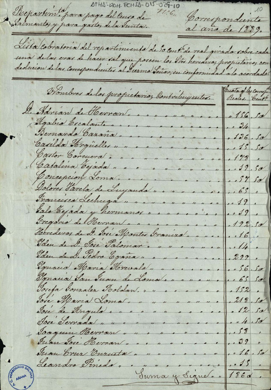 Lista cobratoria para el pago del censo de Salmantón y de 50 céntimos de real por cada era de sal para gastos de junta entre los miembros de la Comunidad de Herederos de las salinas de Añana, correspondiente al año 1889