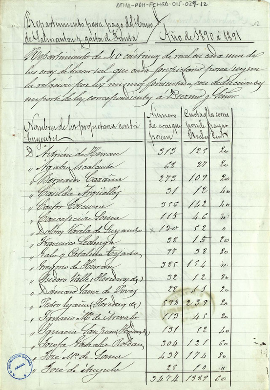 Repartimiento para el pago del censo de Salmantón y gastos de junta entre los miembros de la Comunidad de Herederos de las salinas de Añana, correspondiente al periodo 1890 - 1891