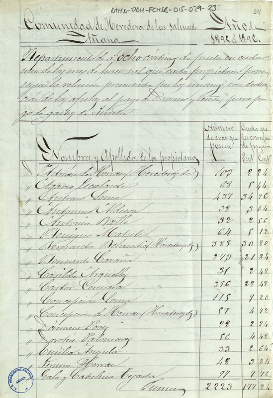 Repartimiento para el pago del censo de Salmantón y gastos de junta entre los miembros de la Comunidad de Herederos de las salinas de Añana, correspondiente al periodo 1895 - 1896