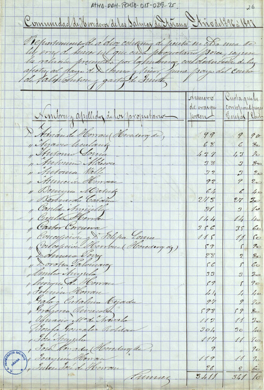 Repartimiento para el pago del censo de Salmantón y gastos de junta entre los miembros de la Comunidad de Herederos de las salinas de Añana, correspondiente al periodo 1896 - 1897