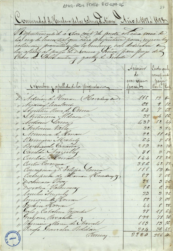 Repartimiento para el pago del censo de Salmantón y gastos de junta entre los miembros de la Comunidad de Herederos de las salinas de Añana, correspondiente al periodo 1897 - 1898