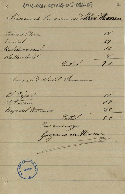 Razón certificada por Gregorio de Herrán, de las eras de hacer sal que poseían Juan José Herrán y Vidal Amárica en la villa de Salinas de Añana y como miembros de la Comunidad de Herederos de las salinas de Añana, sumando un total de 91 el primero y 55 el segundo