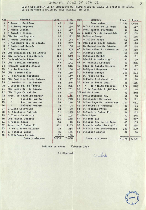 Lista cobratoria de la Comunidad de Propietarios de sales de Salinas de Añana de un reparto a razón de 3 pesetas por era