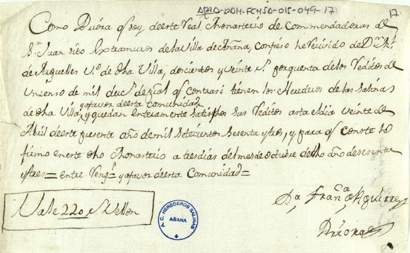 Recibo de 220 reales de vellón otorgado por Francisca de Aguirre como priora del convento de San Juan de Acre extramuros de la villa de Salinas de Añana, en favor de Manuel de Argüelles, vecino de la villa de Salinas de Añana, en concepto de los réditos de un censo de 1.000 ducados de principal que tenía en su contra la Junta de Herederos de las reales salinas de Añana