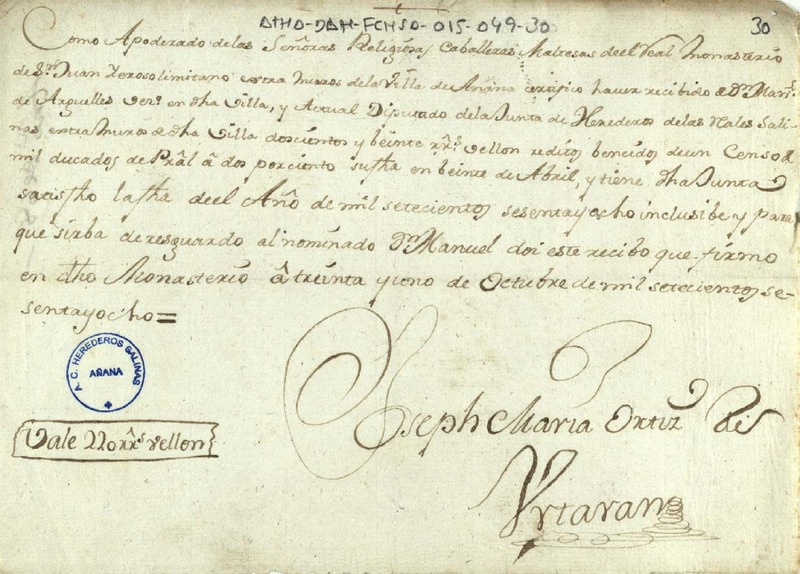 Recibo de 220 reales de vellón otorgado por José María Ortiz de Urtaran, como apoderado de las señoras religiosas caballeras maltesas del Real monasterio de San Juan Yeroso limitado de Salinas de Añana, en favor de Manuel de Argüelles, vecino de la expresada villa y Diputado de la Junta de Herederos de las salinas de Añana, en concepto de los réditos de un censo que tenía en su contra la expresada Junta