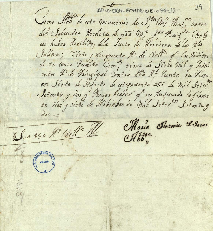 Recibo de 150 reales de vellón otorgado por María Antonia de Jesús, como abadesa del monasterio de Santa María Magdalena orden del Salvador recoletas de Santa Brígida extramuros de la ciudad de Vitoria, en favor de la Junta de Herederos de las salinas de Añana, en concepto de los réditos de un censo de 7.500 reales de principal debidos por la expresada Junta