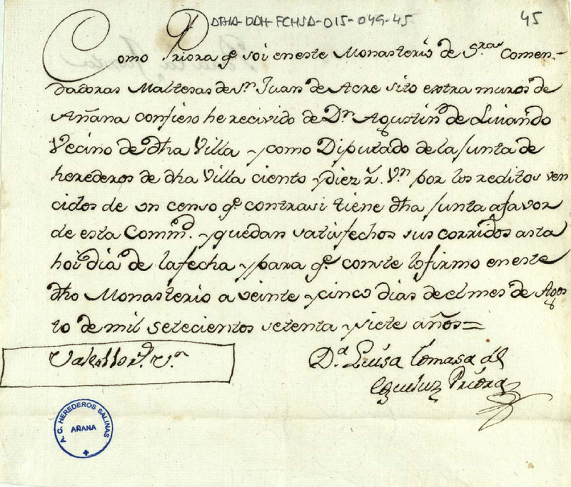 Recibo de 110 reales de vellón otorgado por Luisa Tomasa de Eguíluz, como priora del Monasterio de señoras comendadoras maltesas de San Juan de Acre sito extramuros de la villa de Salinas de Añana, en favor de Agustín de Luyando, vecino de dicha villa y Diputado de la Junta de Herederos de dicha villa, en concepto de los réditos vencidos de un censo que tenía en su contra la expresada Junta