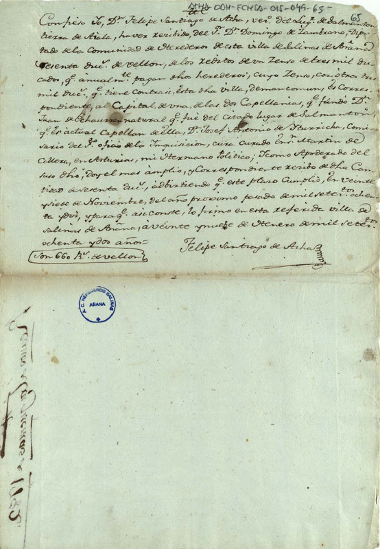 Recibo de 660 reales de vellón, otorgado por Felipe Santiago de Acha vecino de Salmantón, en favor de Domingo de Zambrana, como Diputado de la Comunidad de Herederos de las Reales salinas de Añana, en concepto de los réditos de un censo de 3.000 ducados debidos por los expresados Herederos a la capellanía fundada por Juan de Echaurren en la iglesia parroquial de Salmantón, de la que es beneficiario al momento, el hermano político del otorgante, José Antonio de Iturricha