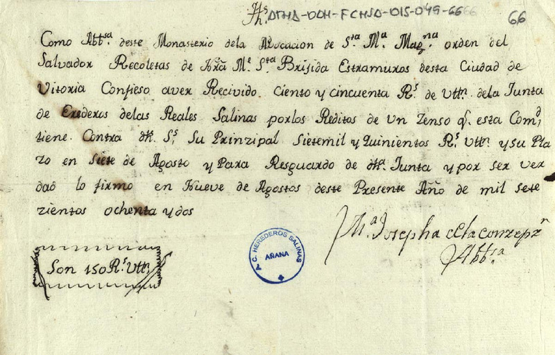 Recibo de 150 reales de vellón otorgado por María Josefa de la Concepción, como abadesa del monasterio de Santa María Magdalena orden del Salvador recoletas de Santa Brígida, extramuros de la ciudad de Vitoria, en favor de la Junta de Herederos de las salinas de Añana, en concepto de los réditos de un censo de 7.500 reales de principal debidos por la expresada Junta