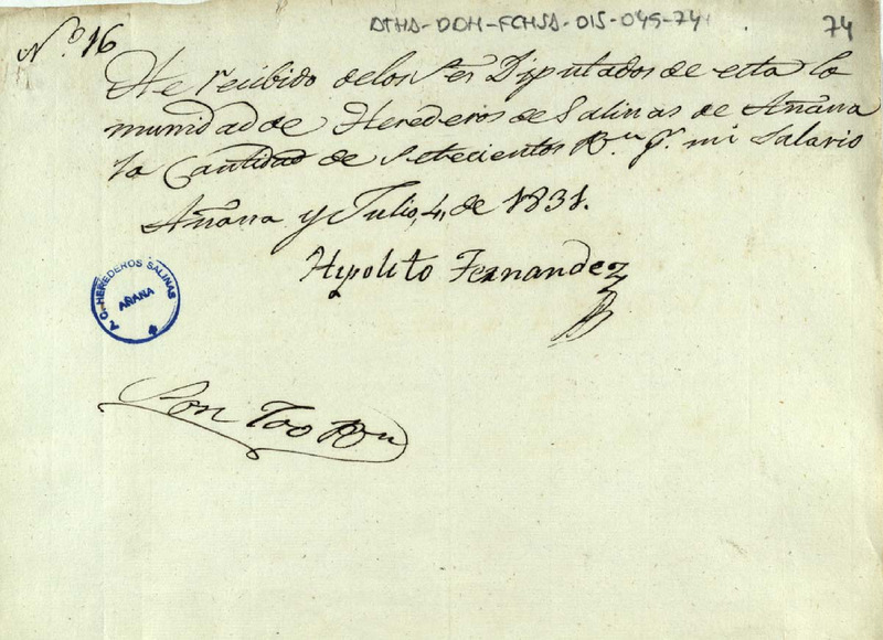 Recibo de 100 reales de vellón otorgado por Hipólito Fernández, en favor de los Diputados de la Comunidad de Herederos de las salinas de Añana