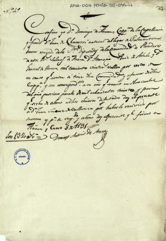 Recibo de 1.320 reales de vellón, otorgado por Domingo Antonio de Arana, capellán de la capellanía fundada por Juan de Echaurren, en favor de Atanasio Ruiz de Arbulo y Gabriel de Herrán, como Diputados de la Comunidad de Herederos de las Reales salinas de Añana, en concepto de los réditos de un censo debidos por los expresados Herederos a la citada capellanía
