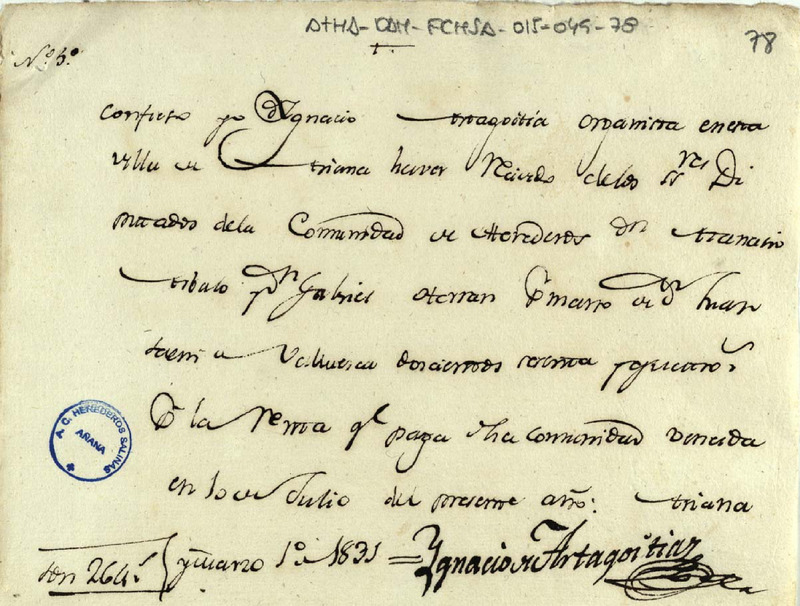 Recibo de 264 reales de vellón otorgado por Ignacio de Artagoitia, organista de la villa de Salinas de Añana en favor de Atanasio Arbulo y Gabriel de Herrán, como Diputados de la Comunidad de Herederos de las salinas de expresada villa, por la renta que paga la expresada Comunidad