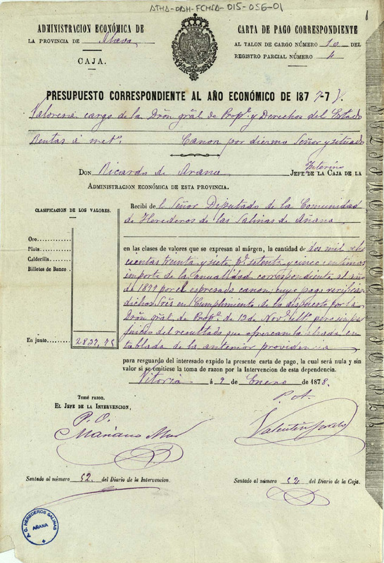 Carta de pago de 2.837,75 pesetas otorgada por la Administración Económica de la provincia de Álava en favor de la Comunidad de Herederos de las salinas de Añana, en concepto del canon del Diezmo Señor y Situado de 1877