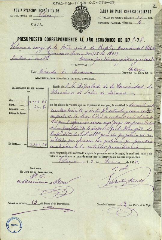Carta de pago de 2.837,75 pesetas otorgada por el Jefe interino de la Caja de la Administración Económica de la provincia de Álava, Ricardo de Arana, en favor del Diputado de la Comunidad de Herederos de las salinas de Añana, en concepto del canon del Diezmo Señor y Situado de 1876