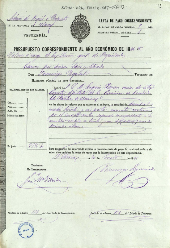 Carta de pago de 2.836,41 pesetas otorgada por Tesorero de la Hacienda Pública de la provincia de Álava, Domingo Izquierdo, en favor de Gregorio Herrán, como Diputado de la Comunidad de Herederos de las salinas de Añana, en concepto del canon del Diezmo Señor y Situado de 1884