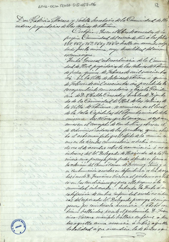 Certificado expedido por Patricio de Moraza y Vadillo, secretario de la Comunidad Herederos propietarios de las salinas de Añana, del acuerdo adoptado por la expresada Comunidad en Junta General extraordinaria de 15 de febrero de 1906, por el que se aprobaba que Francisco Varona realizase un préstamo para la atender a la redención del censo o canon del Diezmo y Señor, aprobándose de igual manera las condiciones de dicho préstamo