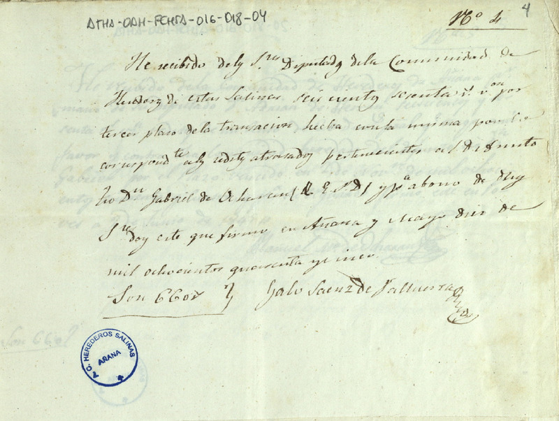 Recibo de 660 reales otorgado por Galo Sáenz de Valluerca, en favor del Diputado de la Comunidad de Herederos de las salinas de Añana, en concepto de los réditos atrasados pertenecientes al difunto Gabriel de Ocharan