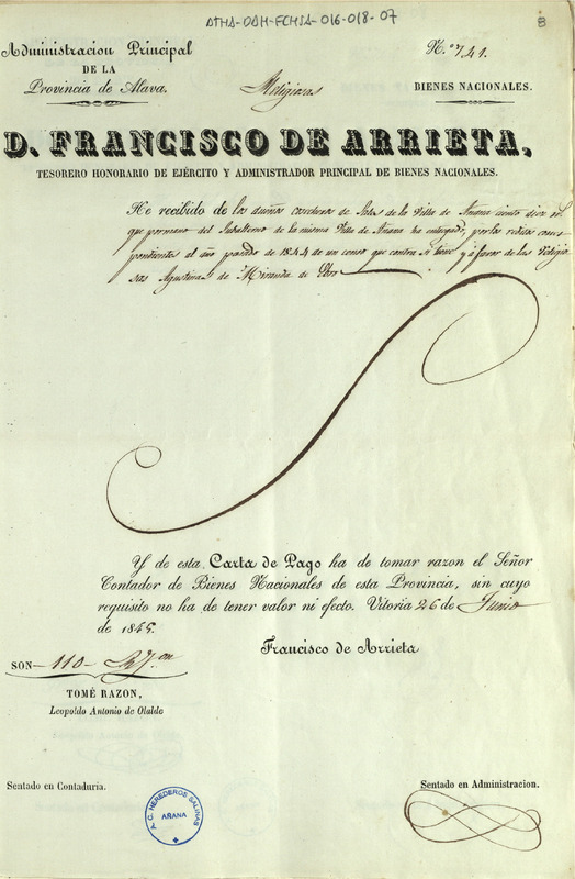 Recibo de 110 reales de vellón otorgado por Francisco de Arrieta, como Administrador Principal de Bienes nacionales de la provincia de Álava, en favor de la Comunidad de Dueños cosecheros de sales de Añana, por los réditos de un censo que tienen a su favor las religiosas Agustinas de Miranda de Ebro