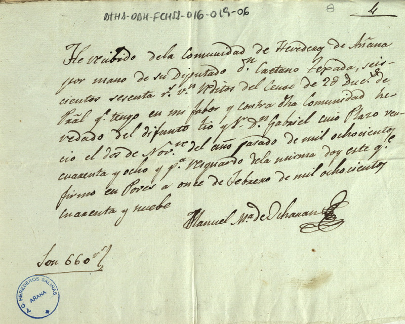 Recibo de 660 reales de vellón otorgado por Manuel María de Ocharan, en favor Cayetano de Tejada como Diputado de la Comunidad de Herederos de las salinas de Añana, en concepto de los réditos de un censo de 2.000 ducados de principal heredado de su difunto tío Gabriel
